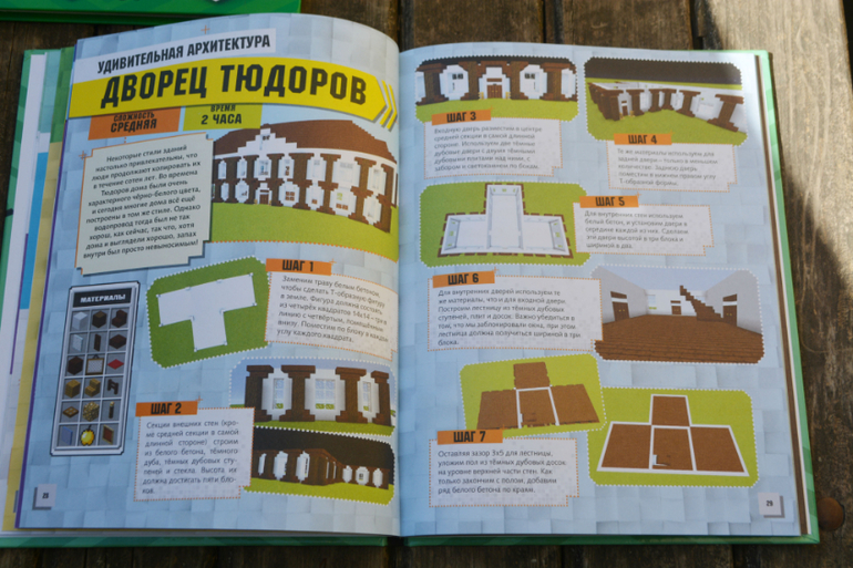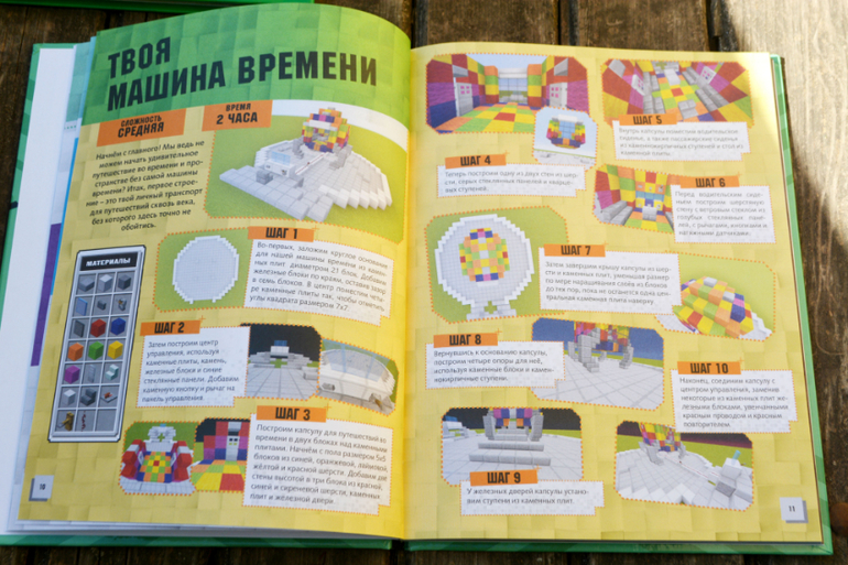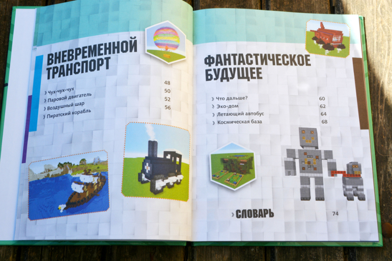 В книге содержаться понятные, пошаговые инструкции и разные лайфхаки по строительству в игре Minecraft разных исторических сооружений (как из прошлого, так и из будущего), тут есть и пиратский корабль и Терракотовая армия, и пирамиды, есть и фантастические объекты, например летающий автобус, ну и многое другое (фото с содержанием я добавлю). Кроме того, в книге содержится и немного интересных фактов о самих исторических объектах, что на мой взгляд является большим плюсом и поможет заинтересовать ребёнка не только архитектурой, но и историей!