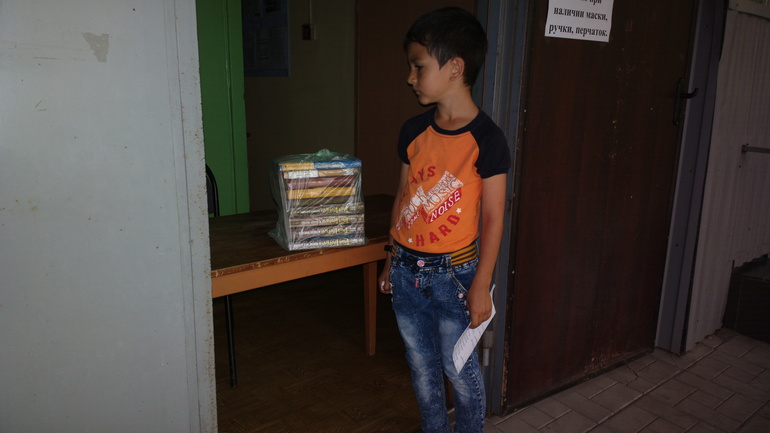Вот на фото сынок пришел в библиотеку менять одну стопочку книг на другую.