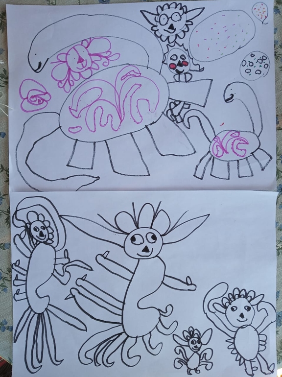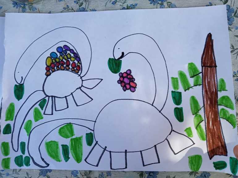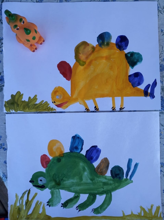 Сын тоже старался не отставать. Вместе рисовали Стегозавра по видеоуроку. Сын рисовал верхнего, практически все сам.