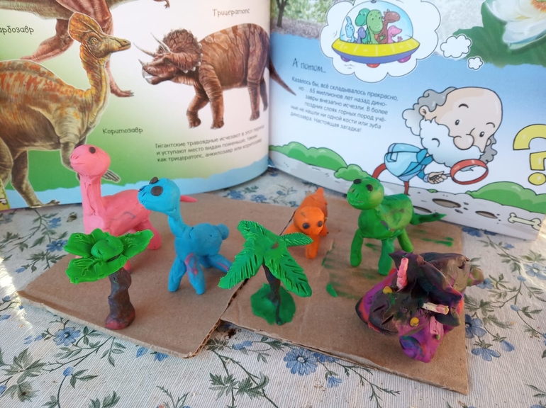 Лепили из пластилина. Дочкины розовый и голубой. Наши с сыном зеленый и оранжевый. Сынок потом еще трицератопса сделал, точнее он сделал нечто, а уж мы с дочкой решили, что очень на трицератопса похоже и подправили))