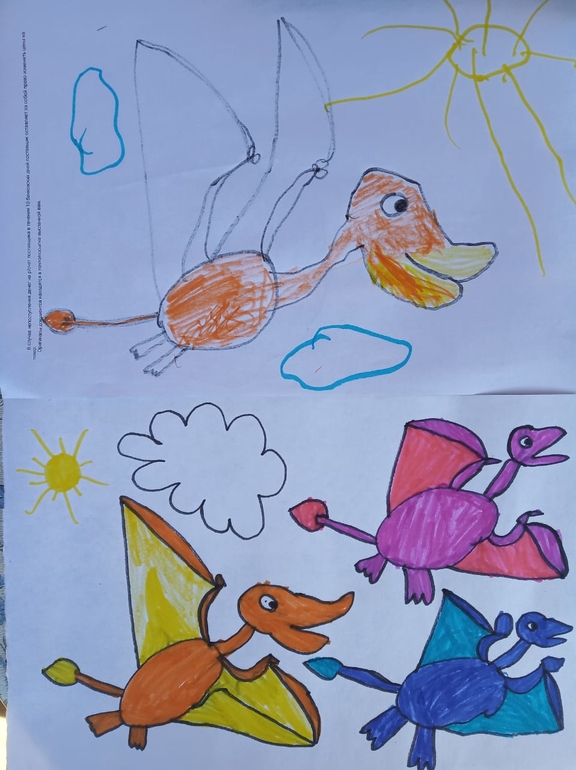 Птеродактилей тоже по видеоуроку рисовали (Дочка потом еще несколько штук нарисовала сама уже). Мы с сыном рисовали верхнего.