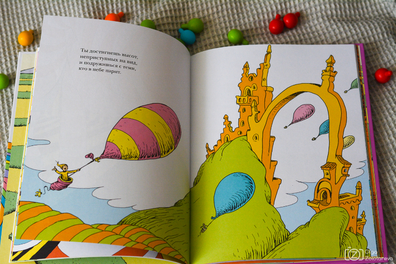 Это только начало. Доктора Сьюза мы любим! Но не всё в равной мере: в Котом в шляпе ничего не сравнится. И всё же я решила купить ещё одну книгу в нашу библиотеку... Пока резюме такое: можно было и не покупать, а почитать в электронке. Ибо я не фанат мотивационных речей и книг оно и видно "ты сможешь, у тебя всё получится! ", и дочка не прониклась. Но книга занятная, яркая, и в отличие от многих других книг автора, не содержит ругательств))) В общем, буду иногда примерять к себе роль лайф-коуча хи-хи и вдохновлять дочь на достижение невиданных вершин.