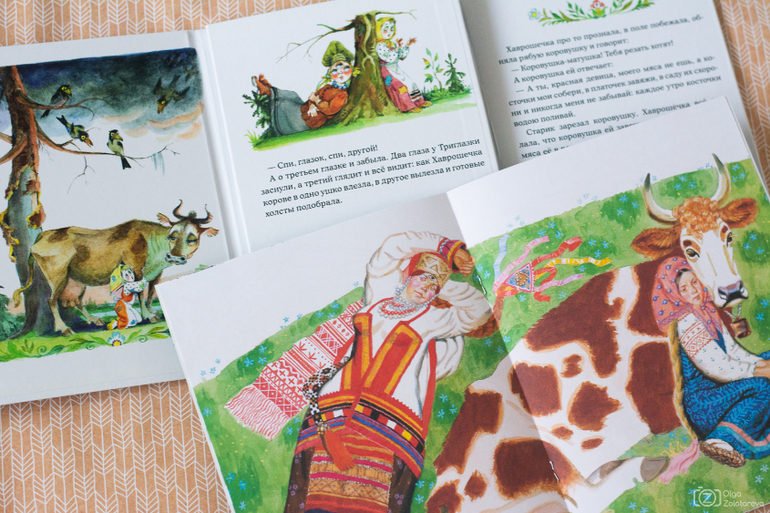 Хаврошечка У нас две книги оказались дома: тонкая скрепка и раскладушка на картоне (я не смогла выбрать, хоть сказка и не из самых любимых). Познакомившись с обеими очно, выбираю картонку из-за необычного формата. При всей моей любви к В. Лосину, реалистичность изображений "сестёр" Хаврошечки сделала сказку особенно страшной, имхо. Дочка вроде не впечатлилась одно/трехглазыми девицами и выбирает сразу две книги. Сказка ей понравилась.