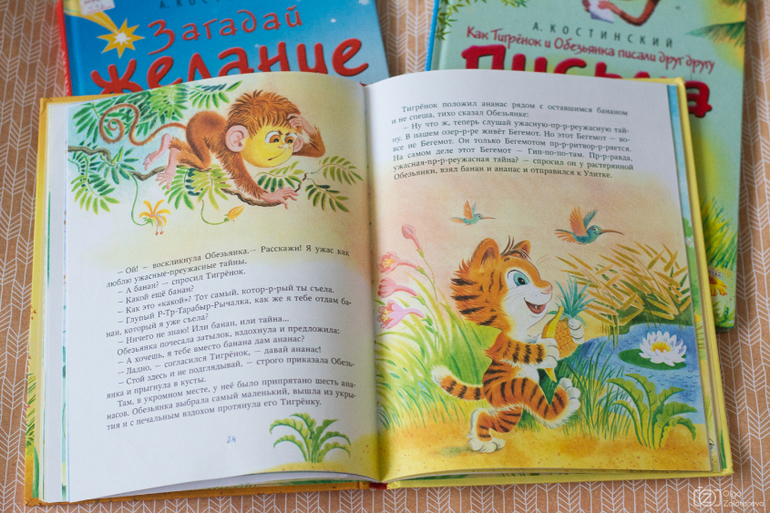 Тигрёнок Рррр Серия из четырёх книг. На наш семейный взгляд, милые книги, но ничего особенного. Некоторые истории весьма смешные, некоторые - откровенно скучные, для взрослых, по крайней мере, некоторые заставляют задуматься и обсудить. Книги вроде как уже не продаются, мы брали в библиотеке - там и можно к ним присмотреться.