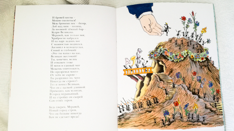 Сказ про муравья и великана Тонкая книжка про бесстрашного муравья и бессовестного мальчишку, который сперва разрушил муравейник, а потом осознал глубину своего проступка и исправился. Как и всегда в подобных книгах, особый интерес здесь представляет нарисованный в деталях муравьиный дом.