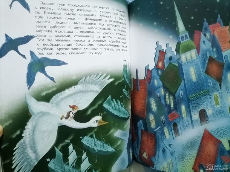 . В нашей семье иногда бывает так. Сперва папа вспомнил в очередной раз про любимую книгу своего детства, мол, когда бы уже начать читать её дочке. Мама поглядела возрастные рекомендации и начала неспешно посматривать на разные издания (книга, к слову, и у мамы была любимой в детстве, так что выбор предполагался ответственный, но и времени впереди ещё много). ... А бабушка просто пошла в книжный, купила Нильса - и всё, немедленно надо читать. Мне не нравится ни перевод, ни иллюстрации (красочные, но компьютерные, я такое не-а). Бабушка тоже, начав читать, поняла, что перевод далёк от того самого, более художественного и попросту привычного. Но она всё ещё не может привыкнуть к тому, что изобилие на книжном рынке обязывает перед покупкой классического произведения перелопатить кучу информации, чтобы выбрать достойное издание. На книгу нашу, справедливости ради, отзывы не плохие, и она действительно неплоха. Просто не та, которой хотелось бы доверить нести звание "любимой книги мамы и папы, прочитанной своим дочерям". Не знаю, что и делать. Некоторые книги из числа поспешно купленных я заменяла впоследствии лучшими изданиями, плодя дубли. Книгу ещё не дочитали, но это вопрос нескольких вечеров. Лиде нравится.