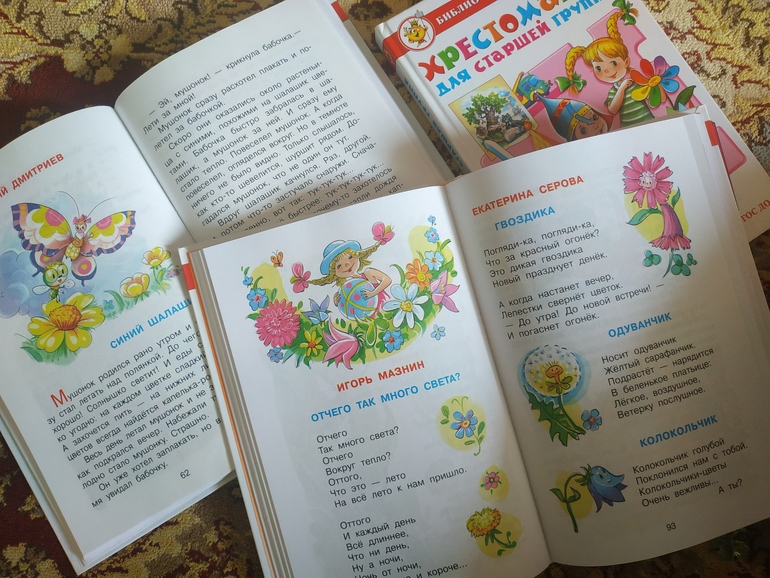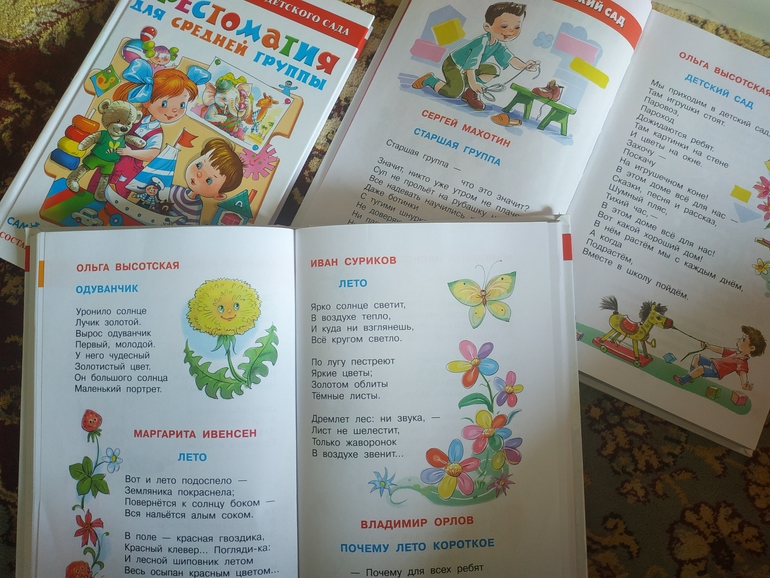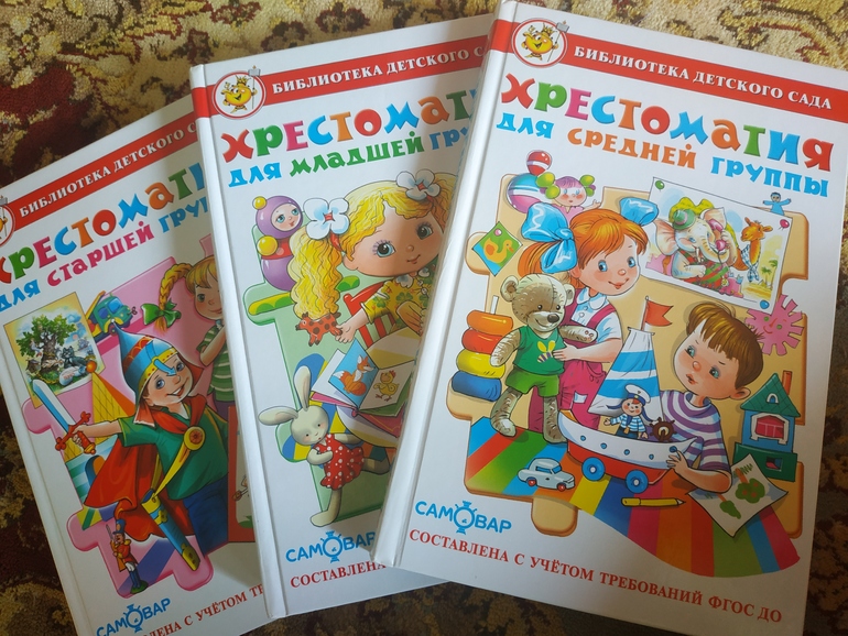 А эти три сборника покупались года три назад, когда дочка пошла в садик. Но до сих пор часто достаются с полки. Читали выборочно из них стихи и рассказы.