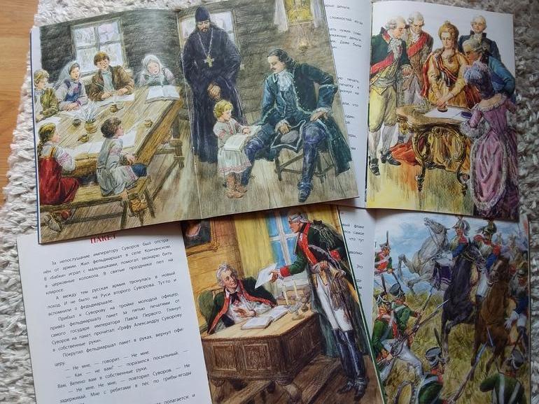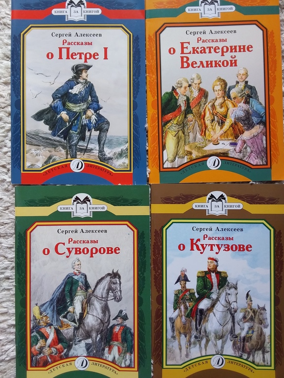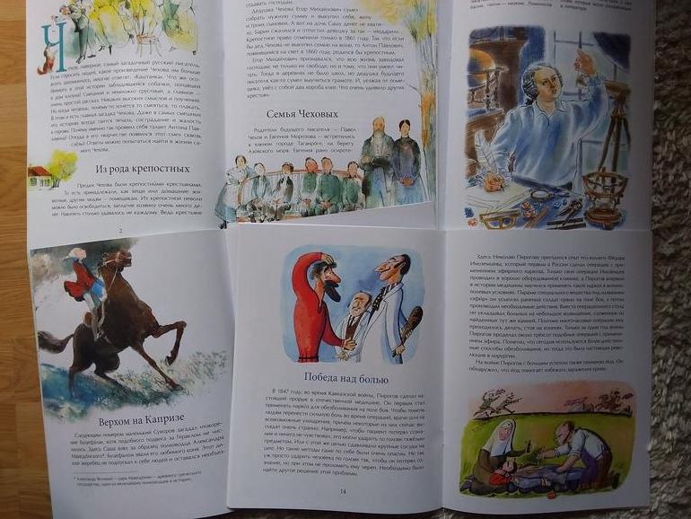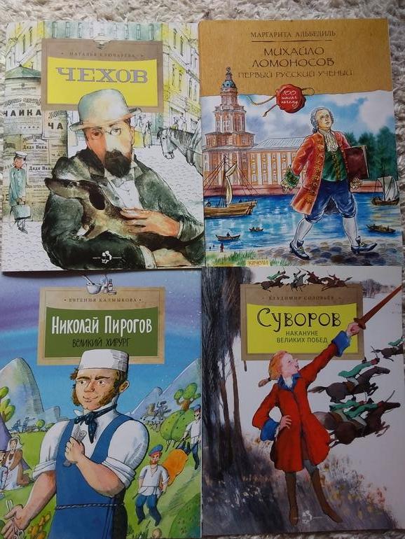 Пирогов, Чехов, Суворов, Ломоносов. Про Ломоносова у меня была еще книжка "Мальчик из Холмогор" от Речи, но меня не устроило качество книги, несколько иллюстраций на всю книгу, дак мне еще и с браком внутри досталась, так что не стала оставлять. Но если бы выпустили красивое издание, то заново купила бы домой.