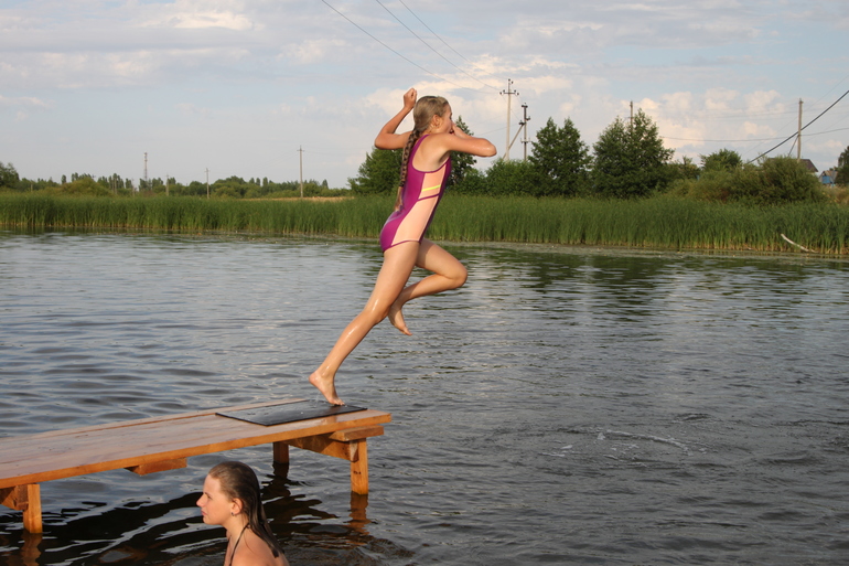 Купались на реке, дочь научилась у местных ребят прыгать со всевозможных мостков и нырять, как лягушка