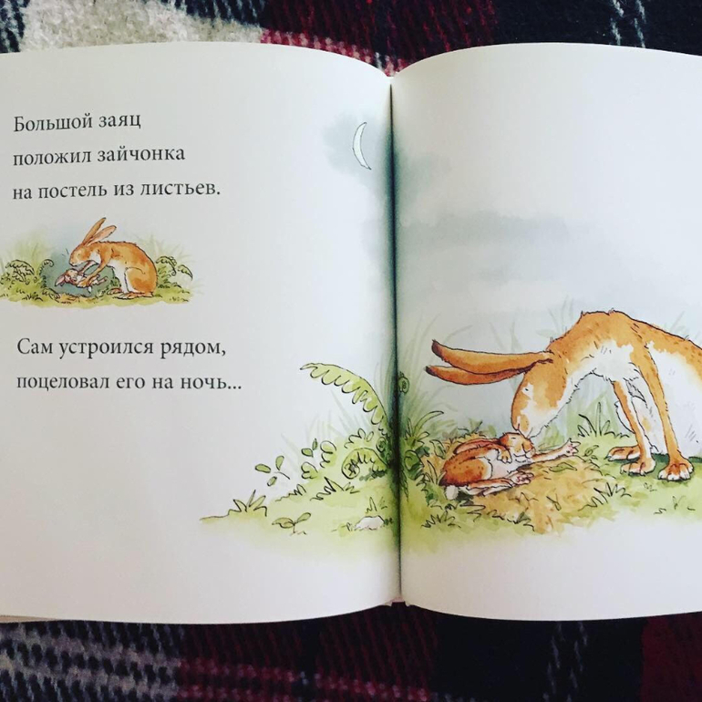 «Я люблю тебя до самой луны!» - шепчет зайчонок своему папе. «И я тебя люблю до самой луны, - отвечает большой заяц. - … и обратно».