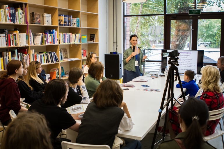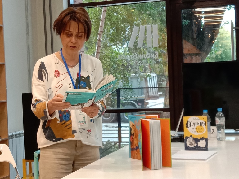 Она рассказала о книге "Ирка.Тимофей". Историю создания, когда она во время командировки в Красноярск однажды вечером осталась наедине с собой, без телефона и планшета, и именно тогда практически полностью придумала историю Тимофея.О том, что после истории необычного Игната ("Я не тормоз") и еще более необычного Лёвки ("День числа Пи") захотела написать историю очень обычных людей, которые осознают эту свою обычность и переживают из-за этого.