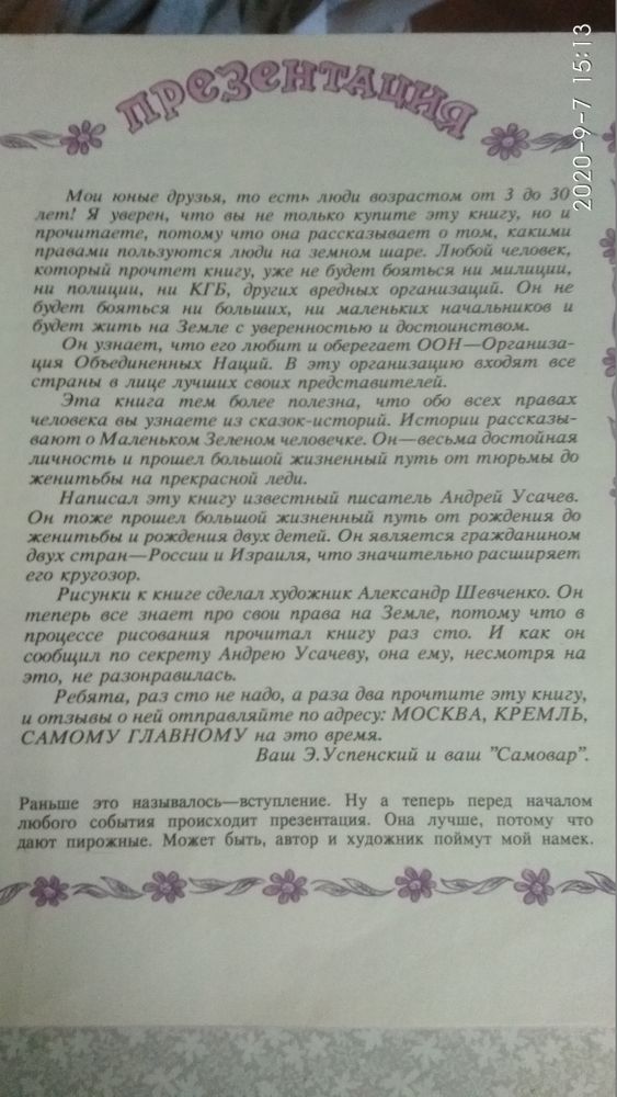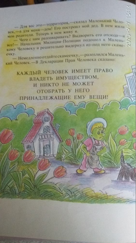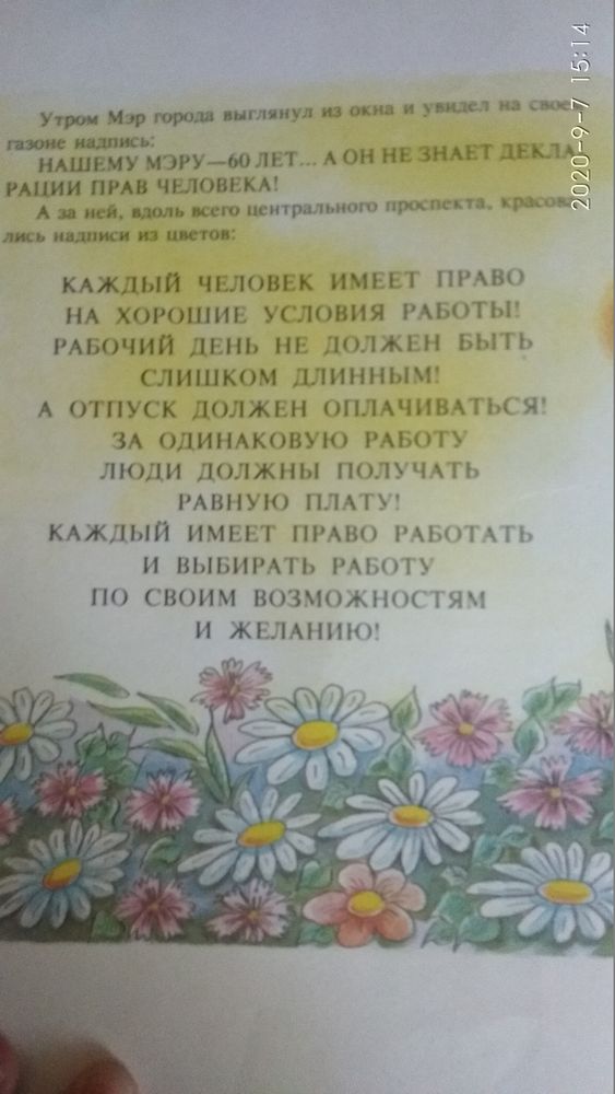 Так как тут в сообществе заинтересовались этой малоизвестной книгой, то предложила прочитать её сыну. Ведь Усачёва мы очень любим. Это перестроечная книга. Вот почему ее хотели выбросить. Да, влияние времени, никуда не деть. Эта книга про права человека. Я просто покажу несколько разворотов. Может кому-нибудь надо? Могу подарить)))).