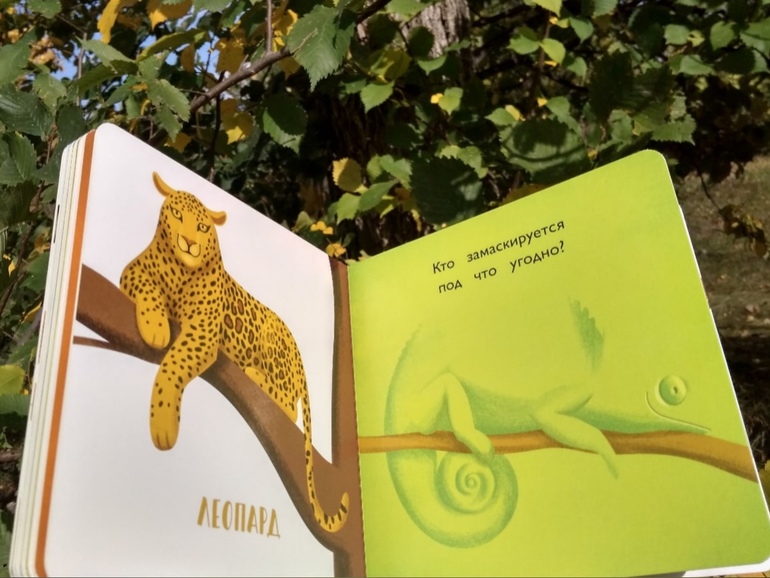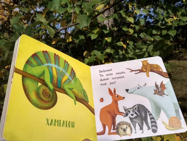 Хамелеон здесь так выпукло нарисован, что каждый раз листая книжку, я провожу пальцами по мордочке и каждый раз снова удивляюсь гладкости страниц - зрительное ощущение, что рисунок тисненый!