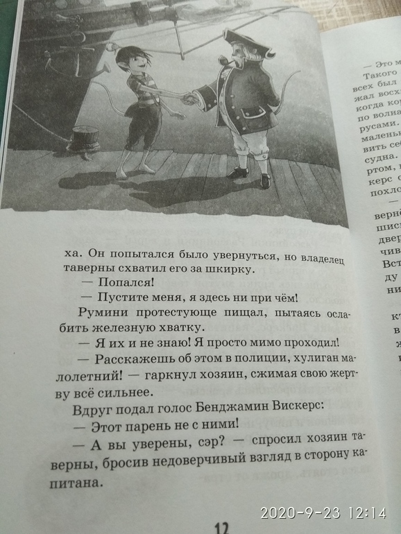 Ну что ж, книжечка очень ладненькая, как снаружи, так и по содержанию. Я ее пока сама прочитала, с сыном еще не читали. Книга на самом деле захватывающая, я прочитала ее на одном дыхании. Мышата в книге изображены в виде человеко-мышей. Иллюстрации черно-белые, но очень четкие. Книга небольшого размера, удобно брать с собой. Единственный минус - это мелковатый шрифт, не очень подходящий для первого чтения. Мы обычно с сыном читаем по осереди, с этой книгой даже не знаю, получится ли.Что касается содержания, начинается с того, что Румини чуть не попадает в беду из-за того, что связался с плохой компанией. Но его вовремя замечает капитан корабля "Королева ветров" и приглашает работать на корабль юнгой. О таком подарке судьбы Румини и не мечтал и конечно сразу же соглашается. Это очень умный и находчивый мышонок, хоть иногда он и не соблюдает законы, которые правят на корабле. Не раз он спасает и сам корабль, и его команду, и даже других зверей. Приключений в книге много и никогда не знаешь что ждет за следующим поворотом событий. То корабль чуть не съел огромный осьминог, то они попадают в плен к маленьким существам "эльфам листвы" и еще нет ничего хуже попасть в руки к самым настоящим пиратам.А еще в книге много волшебства, это и нервущийся канат, и шапка-невидимка и чудодейственное растение, которое лечит все болезни, либо эликсир зрелости.В общем, скучать не придется.И немного фотографий, заранее прошу прощения, из меня очень плохой фотограф: