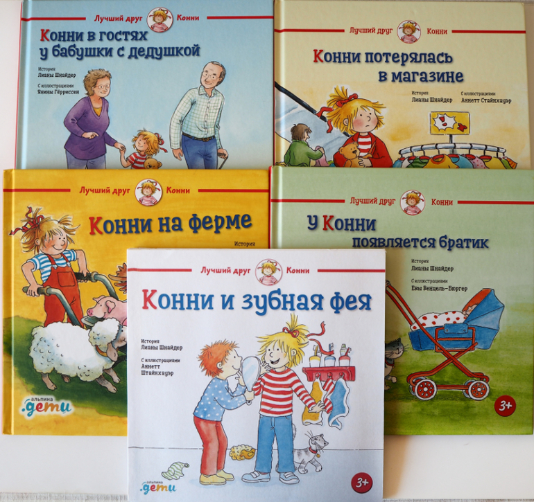 Очень удачная серия про девочку Конни. Как я уже писала - единственный минус это твёрдая обложка. У нас этих книг что-то около 10+-. И я просто больше не могу покупать, так как места они занимают уже прилично. А вот выпускались бы сборниками, как Маруся, или в тонкой обложке - скупила бы, наверно, все. Но очень жду, что книг про подросшую Конни у нас будут выпускать не в меньшем количестве. Место на полочке для них найду)))