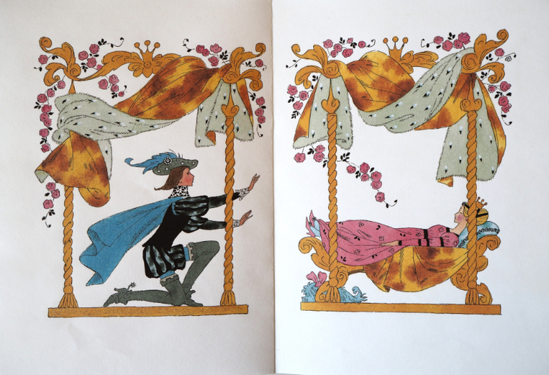 Это самиздат "Спящая красавица". Мне не очень нравится в этой серии, что иллюстрации расположены отдельным разворотом - немного неудобно. Ну и принц принцессу в данном варианте не будит поцелуем - просыпается сама. Вдруг кому-то это важно.