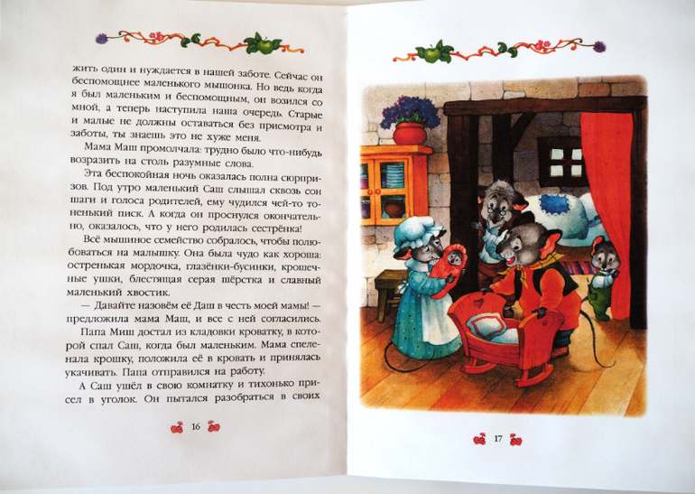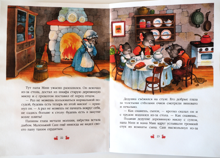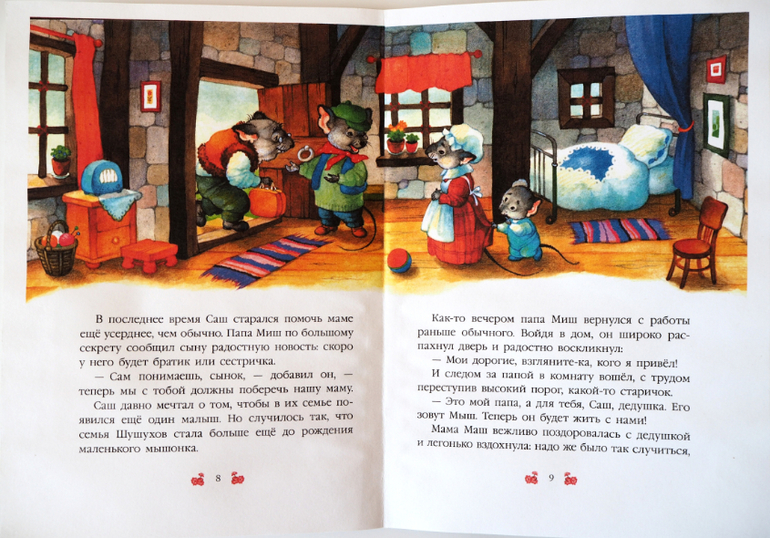 Очень нужная, на мой взгляд, книга - "Дедушка Мыш". История поучительная, на тему, которую очень редко можно встретить. Семья мышек: папа, беременная мама и сынок. К ним переезжает старенький дедушка. Много хлопот с ним добавилось родителям. А с рождением малышки ситуация накалилась ещё больше.