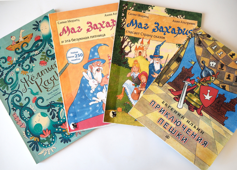 Все четыре самиздат. Мага Захарию я уже столько раз показывала, что, пожалуй, больше не буду пока. Как показывает наш опыт - хотя бы одна дома быть должна)))) Честно - я их терпеть не могу. А дочка обожает. "Приключения пешки" я уже показывала, всё так же книга любима. Нужно присмотреть ещё что-то про шахматы.
