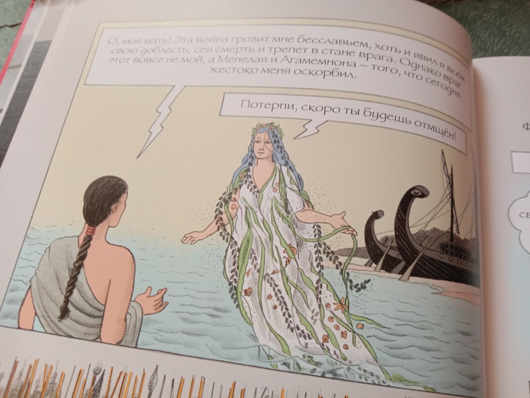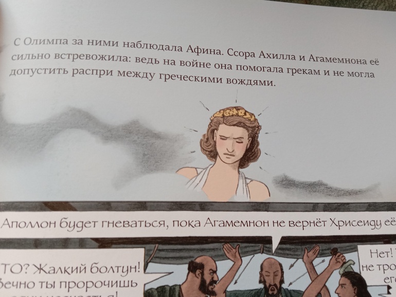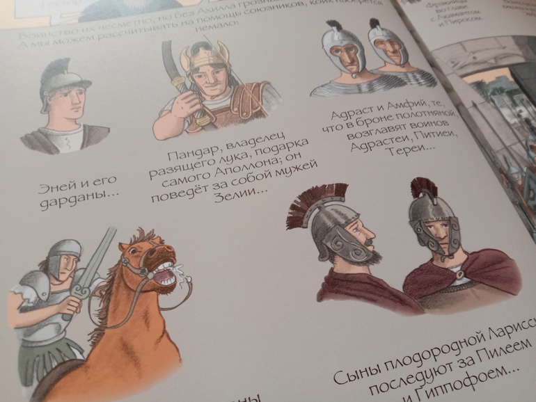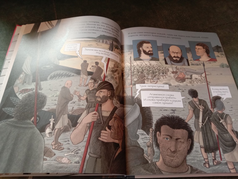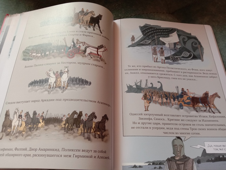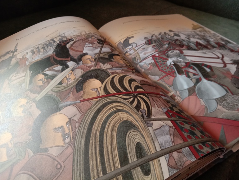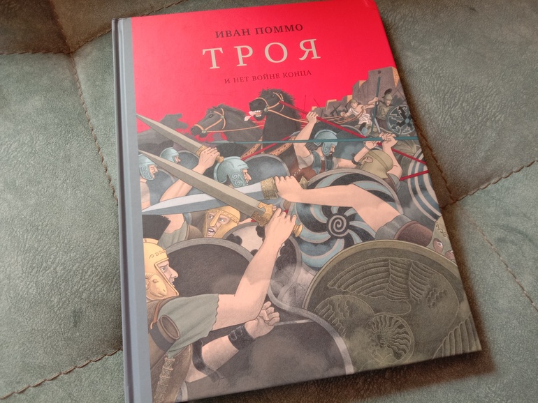 "Троя. И нет войне конца". Переложение "Илиады" для младшего и среднего школьного возраста. С текстом очень крупными буквами, с комиксными вставками, с шикарными панорамными, не побоюсь этого слова, картинами. А главное, всё так кратко - и так точно, без заигрываний с юным читателем, без неуместного юмора и иронии, которые любят подпустить многие современные "пересказатели". Книгу я приобрела для дочки. В целом, с сюжетом она была знакома с раннего детства. За год до её рождения вышел фильм "Троя" с Брэдом Питтом в роли Ахиллеса. Сыну (ему было тогда 7) подарили такую кассету. Он засмотрел ее до дыр. Ну и народившаяся Алёна тут же ползала) В отличие от брата, смотреть в сознательном возрасте "Трою" её не тянуло. Ну и, будем честными, заинтересовать фильм может, а вот с точностью передачи содержания там проблемки есть. И основная - отсутствие богов. А это едва ли не половина "Илиады"... А вот в книге Ивана Поммо, которую я взялась хвалить, таких проблемок не наблюдается). Ну давайте уже на неё посмотрим!