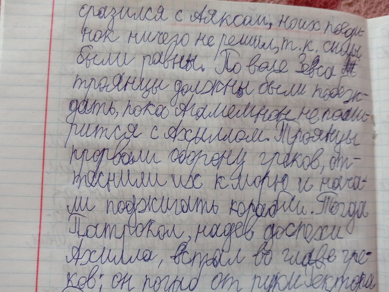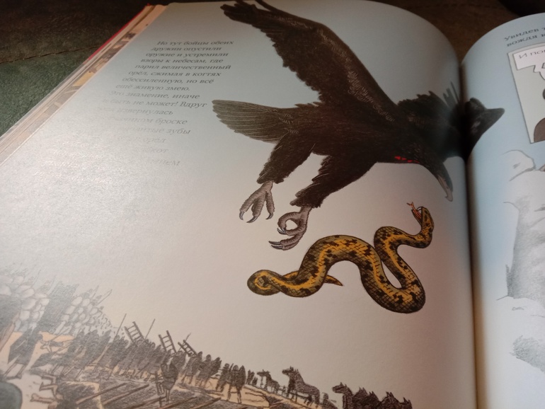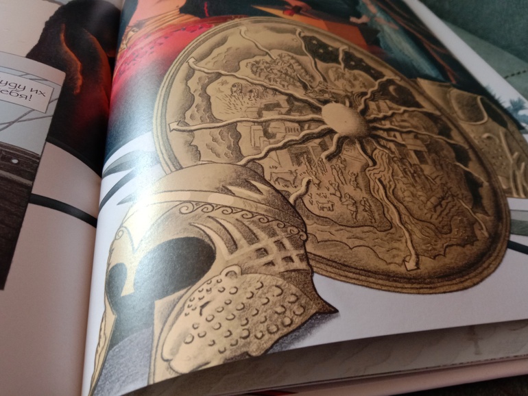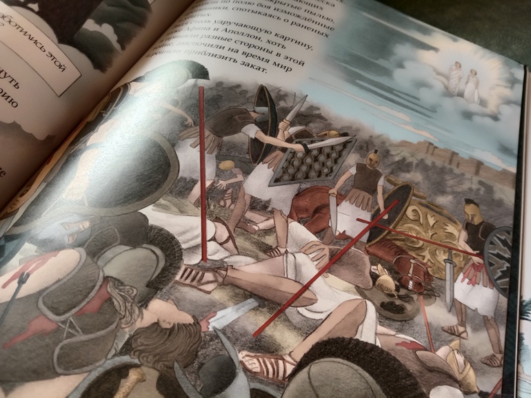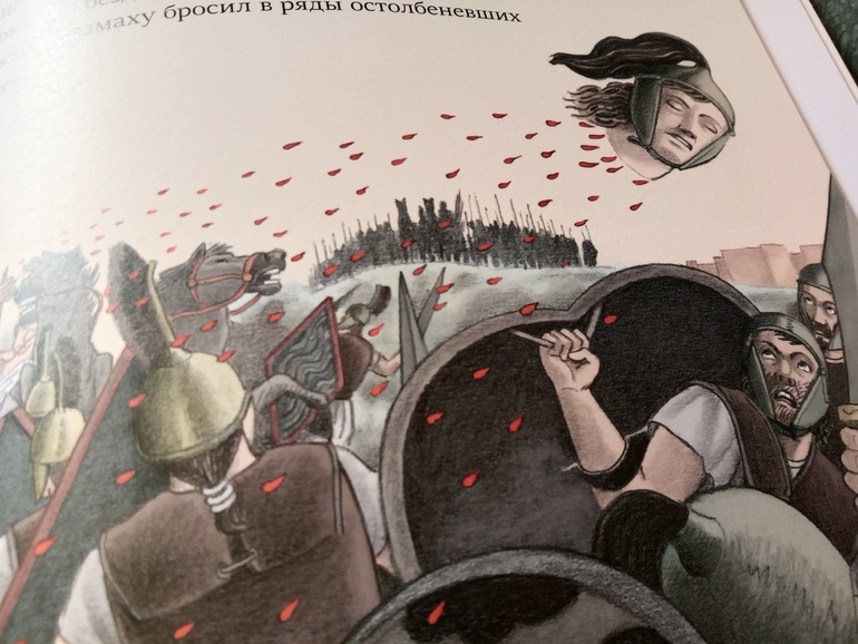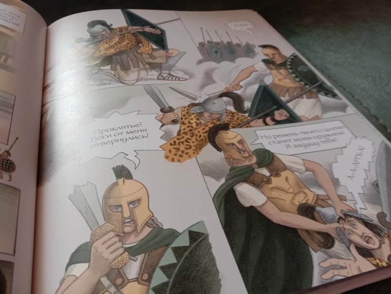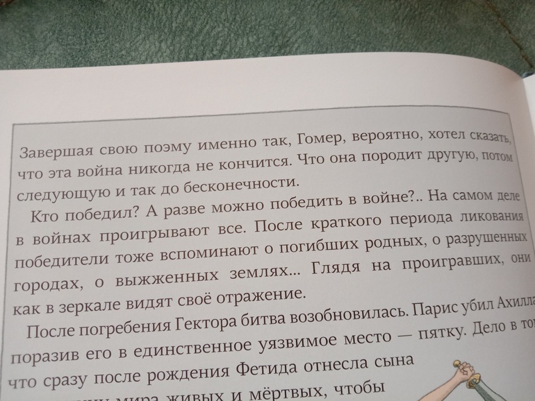 "Троя. И нет войне конца". Переложение "Илиады" для младшего и среднего школьного возраста. С текстом очень крупными буквами, с комиксными вставками, с шикарными панорамными, не побоюсь этого слова, картинами. А главное, всё так кратко - и так точно, без заигрываний с юным читателем, без неуместного юмора и иронии, которые любят подпустить многие современные "пересказатели". Книгу я приобрела для дочки. В целом, с сюжетом она была знакома с раннего детства. За год до её рождения вышел фильм "Троя" с Брэдом Питтом в роли Ахиллеса. Сыну (ему было тогда 7) подарили такую кассету. Он засмотрел ее до дыр. Ну и народившаяся Алёна тут же ползала) В отличие от брата, смотреть в сознательном возрасте "Трою" её не тянуло. Ну и, будем честными, заинтересовать фильм может, а вот с точностью передачи содержания там проблемки есть. И основная - отсутствие богов. А это едва ли не половина "Илиады"... А вот в книге Ивана Поммо, которую я взялась хвалить, таких проблемок не наблюдается). Ну давайте уже на неё посмотрим!