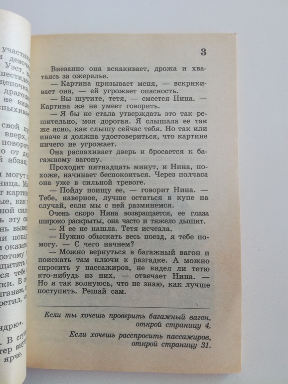 В моем детстве (подростковом возрасте) у меня были книги-игры с выбором сюжета. Я их обожала. На этой неделе была в магазине и увидела подобную, но вроде для малышей. Но книга была запакована и посмотреть страницы я не смогла. А денег с собой у меня не было. И как она называется я не запомнила. Дурочка редкая.