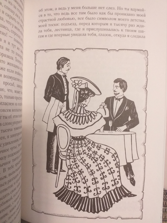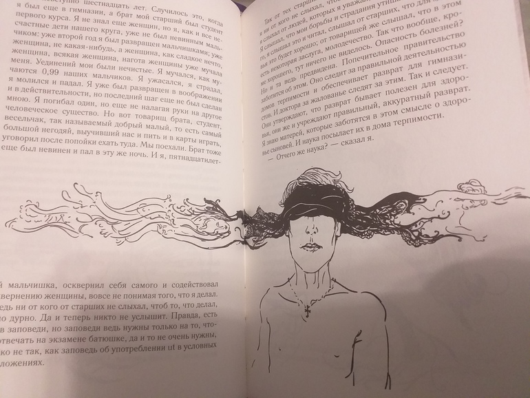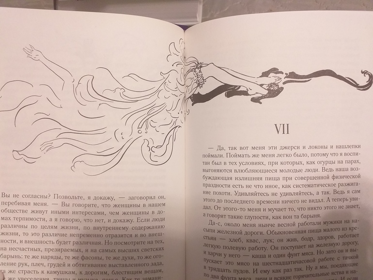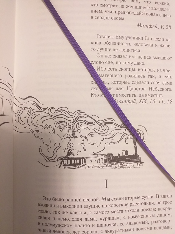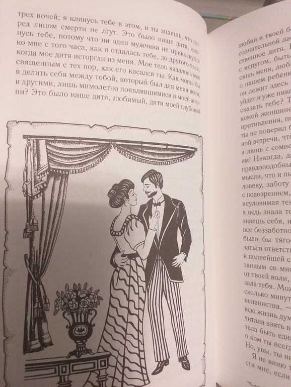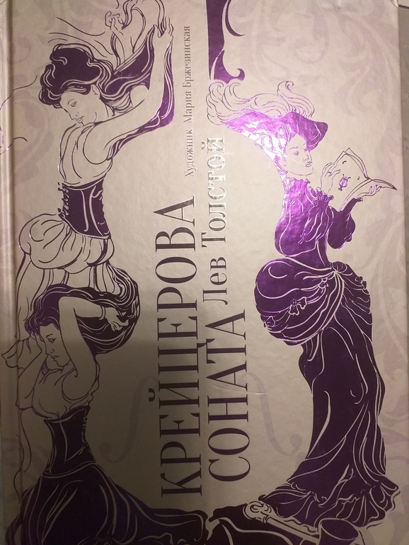 Крейцерова соната. Лев Толстой. Книга шикарно оформлена иллюстрациями! Они не просто присутствуют фоном, они очень стильные и интересные! И их очень много - буквально по пальцам руки можно пересчитать развороты без них. Обложка книги с фиолетовым блеском, в тон ей фиолетовое ляссе.