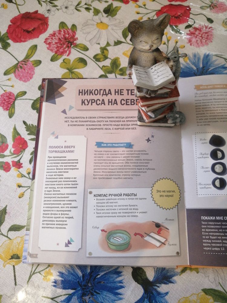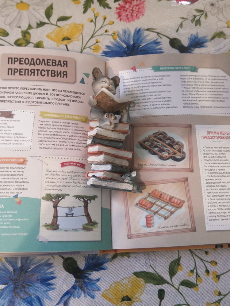шалаш, распознавать следы животных, разжигать костёр, чинить велосипед, грести на плоту, читать карту, материть лук и стрелы, делать водяные бомбы и т. д. Хотела отложить до школы, 7+,но сын увидел и попросил почитать. Масса информации, читается легко, бумага толстая, иллюстрации приятные для глаз, в пастельных тонах. Содержание разбито на разделы:Дома, в горах, в лесу, на море, в джунглях, за городом, в городе. Есть оригами, морской бой, карточные игры, первая помощь..... Всем советую!!!! Текст мелковат, но компенсируется обилием информации по каждому вопросу!