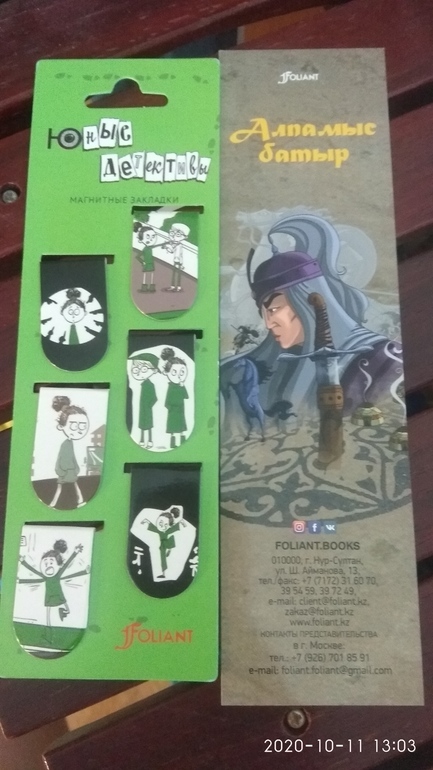 Закладки сразу забрал себе Владик, оказывается только я не видела ещё магнитные закладки))). Они классные. На обратной стороне закладки Алпамыс батыр меры массы).