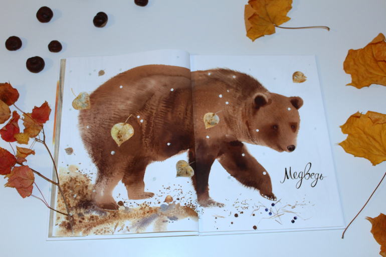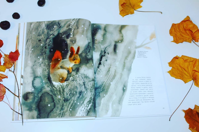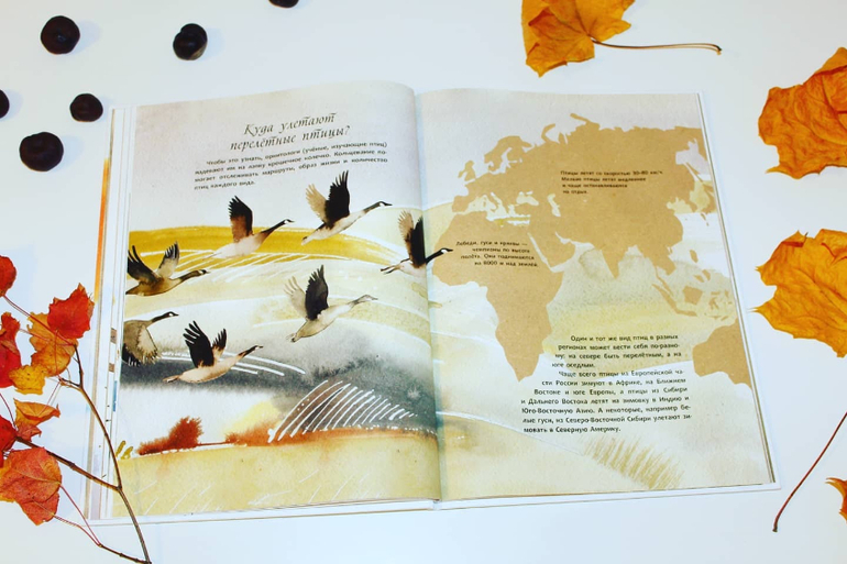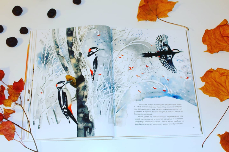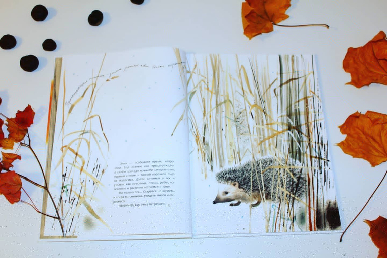 Текст в книге интересный, одна тема плавно переходит в другую. Ольга Фадеева рассказала познавательные факты про всю природу: животные, насекомые, рыбы, птицы, растения. Хоть и читаем с Настей много книг о природе, но автор смогла нас удивить, да не один раз, а много. Вы знали, что температура ёжа, во время зимней спячки, понижается до 2 градусов? Некоторые виды летучих мышей улетаю на юг! Белая куропатка меняет окрас в зависимости от сезона! Полярная крачка пролетает в год до 70 тысяч километров! Охали и ахали с дочкой на каждом развороте.