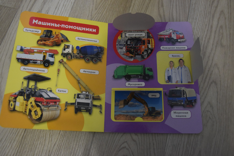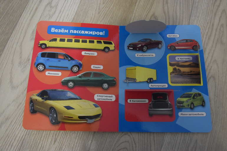 И небольшая книжка с окошками про машины. Средне. Сложные названия для Саши:седан, багги и пр. Но открывает окошки,смотрит. Хотя то,что внутри по мне не всегда ребенку интересно.