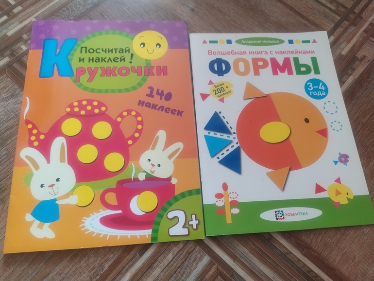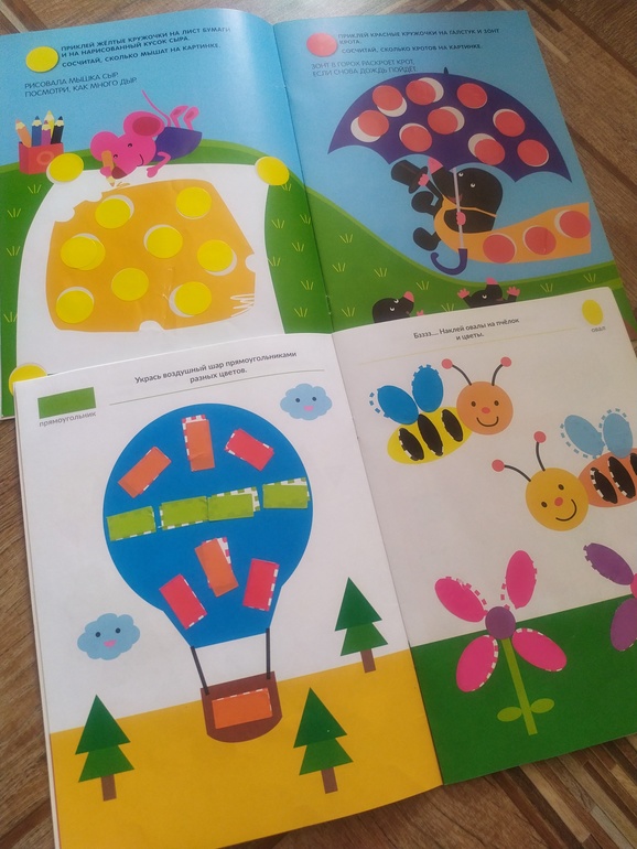 Идеями рисунков и заданиями по возрастающей сложности понравилась мне "Волшебная книга с наклейками. Формы. " от издательства "Хоббитека". Подкачала тетрадь некачественными наклейками: от основы сложно отклеиваются, рвутся. У ребенка не хватало терпения ждать, когда я дам ему следующую наклейку. Наклейки не переклеиваются: