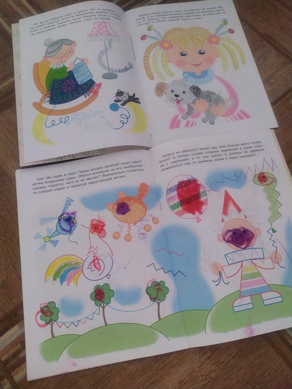 Сыну ни "Спиральки", ни " Зигзаги " не пошли (в "Зигзаги" кружочки, восковым карандашом нарисованные, - работа сына) "Спиральки", купленные специально для сына пока лежат и жду своего часа. Зато "Спаси царевну! " - мужская тема😁 Всю тетрадочку сын и папа разрисовали:
