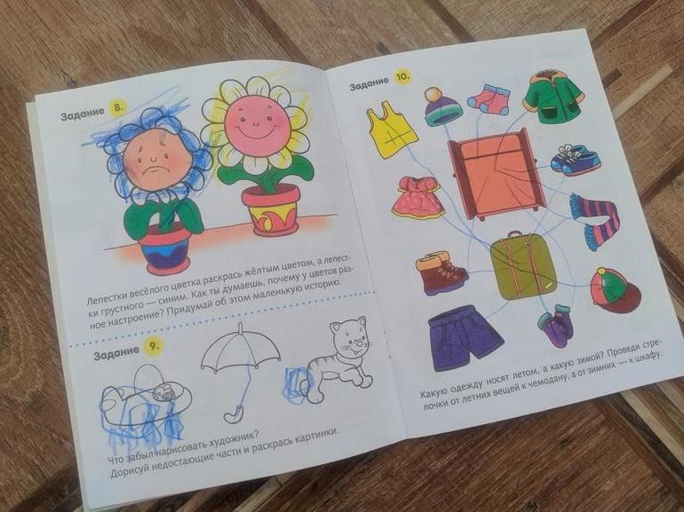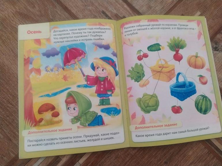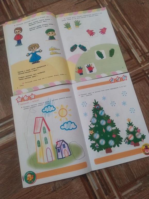 За два подхода была выполнена "Одежда и обувь" от издательства "Экзамен". Много заданий с наклейками, загадки, подобрать пары: