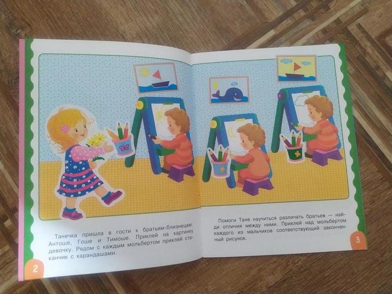 Наклейки хорошего качества, удобный небольшой формат. В "найди отличия" не только картинки сделать одинаковыми, но и есть задания, где на слух важно понять чего не хватает на иллюстрации, всего 10 страниц для работы: