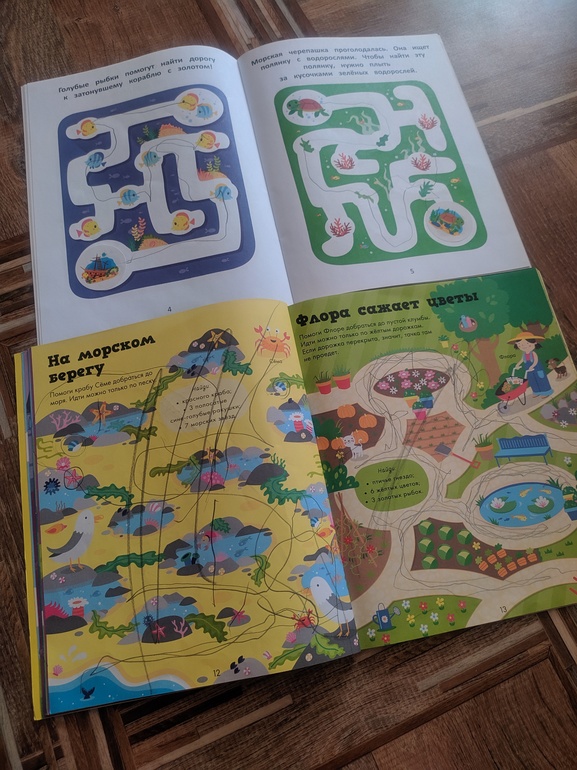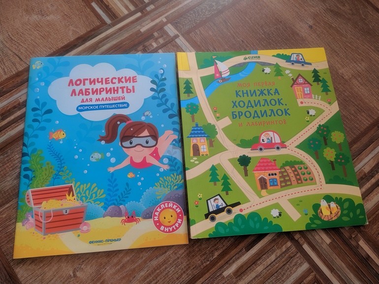 Лабиринты не пользовались популярностью у дочери до появления " Моя первая книжка ходилок, бродилок и лабиринтов" от "Clever". На пятом году жизни она оказалась ей очень простой, поэтому мы больше выполняли задания по ней (искали, считали). А сын отрывался по полной до 3,5 лет, но искать и считать не получалось (мелкие картинки):