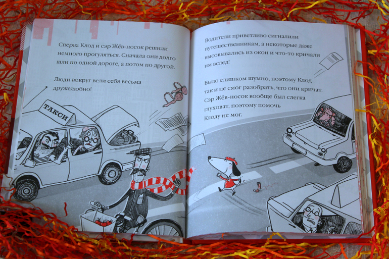 С собой он всегда берет друга - жёванный носок. Вместе им весело открывать все новое вокруг. За один день им удалось понаблюдать за голубями, перекусить в кафе, заглянуть в разнообразные магазины и накупить огромное количество беретов. Береты - это особая слабость Клода. Еще они побывали в художественной галерее и помогли задержать преступника. На следующий день Клод обнаружил, что жеванный носок заболел и отвел его в больницу. Там они тоже навели знатного шороху, зато в итоге помогли всех вылечить.)