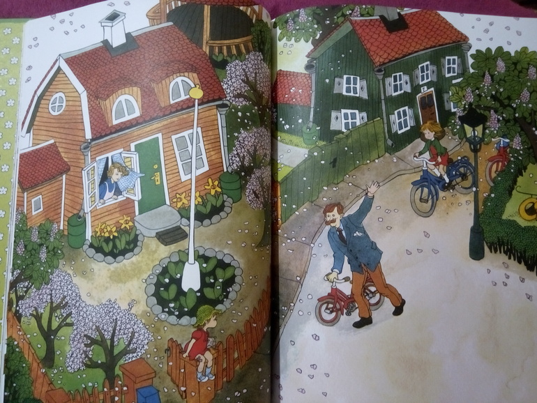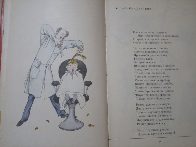 Судя по дочкиному лицу, эта картинка ее сильно напугала. Я конечно говорила ей, что девочку просто стригут, а она плачет потому что боится стричься. На что дочка как-то неуверенно соглашалась: "Да-да. Если стричься решено, плакать глупо и смешно" и опять смотрела на эту злосчастную картинку как кролик на удава. В итоге она даже не стала дочитывать книгу. В течение дня еще несколько раз доставала ее и рассматривала. А потом запрятала подальше. Странно. У меня в детстве была такая книга, и такого впечатления она не производила.
