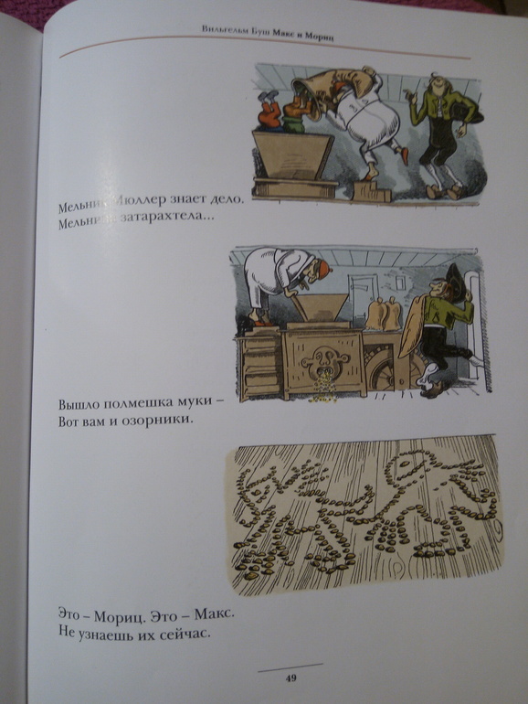 Дочка достала "Макса и Морица" и снова перечитала. Это была одна из первых книг, прочитанных ею самостоятельно в прошлом году. Я сама узнала о ее существовании, прочитав чей-то отрицательный отзыв в категории "Книжное разочарование". Мне она так понравилась, что я сразу заказала ее у букинистов, так как в продаже она уже отсутствовала. Думала, что заказываю скорее для себя. Но дочка в нее просто влюбилась. И до сих пор иногда перечитывает. Изначально ей больше всего нравилось окончание истории про "Макса и Морица", где их превратили в муку, и история про Ледяного Петера, который растаял. Я так понимаю, что ей просто нравится сам момент превращения и никаких ужасов она в этом не видит )) Дочку всегда забавляла картинка, где фигуры Макса и Морица выложены из зерен.