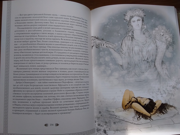 Текст напечатан на очень приятной и плотной тонированной бумаге, в рамочке. Вокруг рамочки - размытые картинки в пастельных тонах, связанные с Древней Грецией. Тонировка и картинки чтению не мешают.