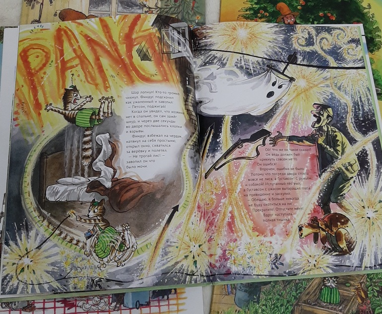 Рисунки в книге очень динамичны, мы на одном развороте можем проследить все действия по тесту, а уж что что, а на месте сидеть этот котенок в полосатых штанах совершенно не может! Очень увлекательно следить и за такими милыми разговорами персонажей! Старина Петсон вечно что то забывает и теряет! То он ищет перец в чемодане, который хранится вообще то багажнике велосипеда, то не может вспомнить, что веревку сам же положил в автомобильную шину🙈