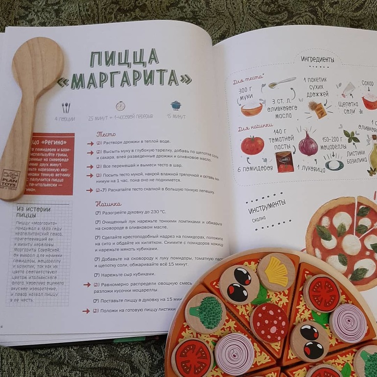 Помимо основного рецепта есть небольшие интересные дополнения, как можно поэкспериментировать и изменить готовое блюдо. Также есть краткие пояснения из истории блюда. Например, повар, приготовивший пиццу к визиту королевы Маргариты, выбрал помидоры, моцареллу и базилик потому что они соответствуют цветам итальянского флага. Пицца пришлась по душе королеве, и в честь нее пицца и получила свое название.