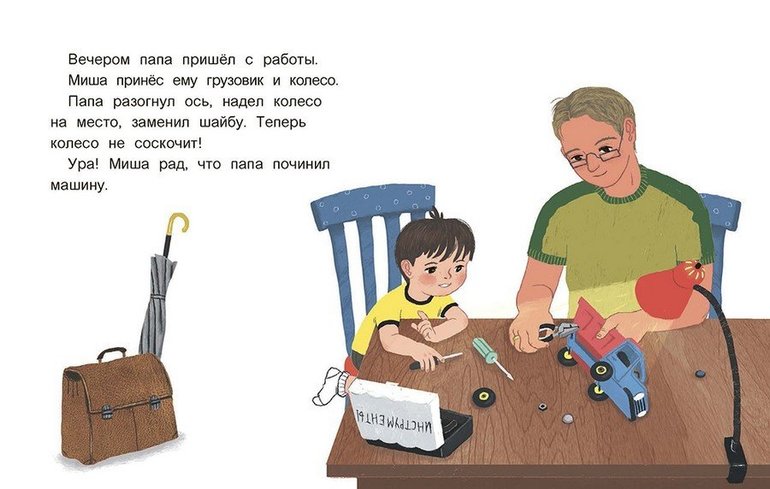 Миша чуть постарше, ему 3-4 года. Он много времени проводит с папой и помогает ему чинить разные вещи. Потом Миша применяет эти навыки в своих играх.