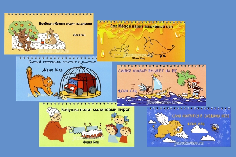 Эти книжки-игрушки можно листать - и хохотать, получая смешные фразы. Когда слова подчёркнуты одним цветом, фразы получаются вполне осмысленными: «Старая яблоня растёт в саду», «Синий кит плывёт на юг», но потом… Перелистываем часть страничек и получаем: