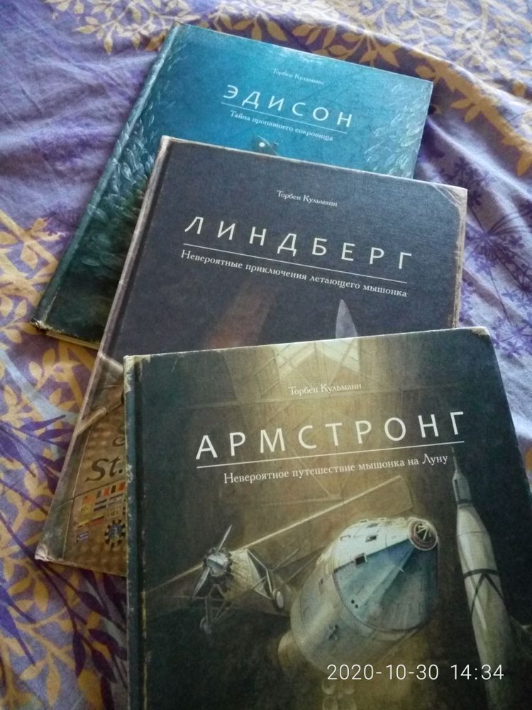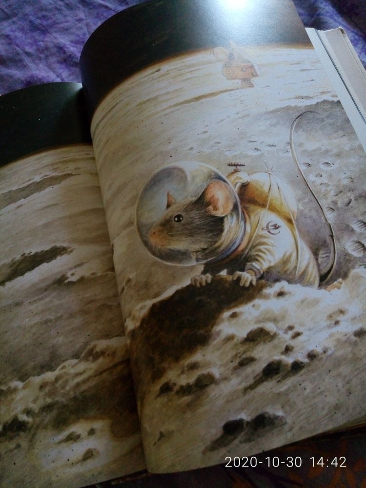 Книги, действительно, красивые, добротные листочки, обложка, рисунки, с этим всё классно. Но вот текст! Его откровенно мало, история про мышонка, примитивная. Хотел мышонок на луну, сделал себе скафандр и ракету, запустил- улетел, походил по луне, спустился обратно. Всё. Причем я думала, что будут какие-то технические подробности, типа конструкция скафандра, ракеты, какие-то такие подробности для мальчишек. На деле только три листа в конце книги о истории космонавтики, совсем чуть. И то для взрослых детей, а сама книга года на 4 тянет. Картинки больше смотреть, чем читать.