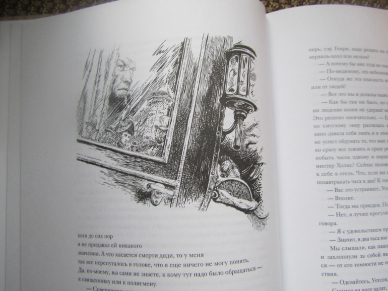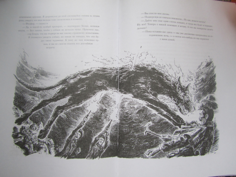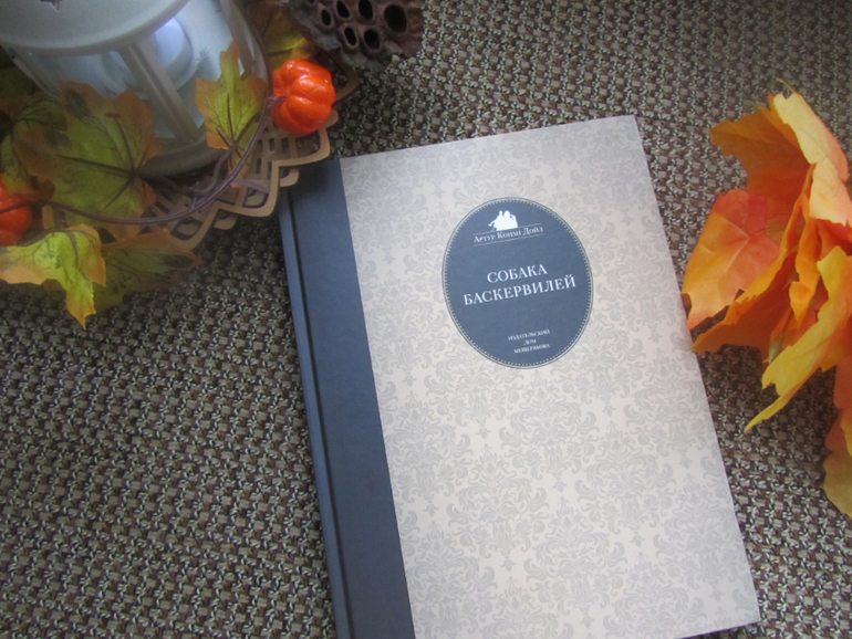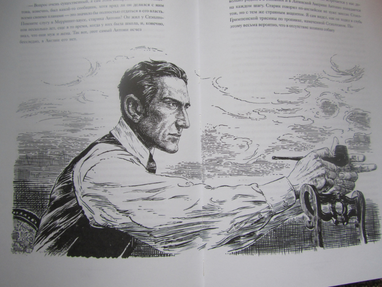Именно осенью я всегда вспоминаю эту любимейшую у Конан Дойля повесть, мне кажется она идеально подходит на эти вечера. Да и вообще большинство детективов автора подходят под осенние вечера, но эта история мне кажется наиболее подходящей. Мистическая, местами жутковатая. хотя как всегда у автора всё в итоге объясняется и мистики никакой и нет вовсе, но всё же.. История жуткой собаки,которая по ночам нападет на людей, торфяные болота, родовое проклятие. Книга сама очень красивая, с вензелями и потрясающими черно-белыми иллюстрациями моего одного из любимейших иллюстраторов Антона Ломаева! Он придумал свои образы главных героев книги, но мне они очень нравятся. Рисунков довольно много на всю книгу, есть полностраничные , есть небольшие совсем, но все они отлично передают дух этой истории. Особенно на мой взгляд Шерлок Холмс у него получился очень интересным и красивым мужчиной )))
