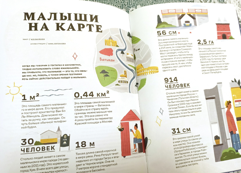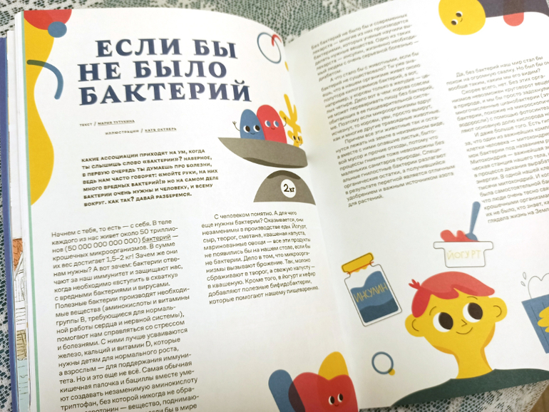 Да, не густо, но ребенка понять можно. И для меня стало неожиданностью столь разнообразное содержание под одной обложкой. На вскидку: разворотов с научной, развивающей информацией здесь большая часть. Почитал, просветился на умную тему и можно отдохнуть на следующем развороте: там можно встретить стихи, рассказы, комикс, загадки (тема всегда в поддержание «умных» разворотов). Мне оказалось самой сложно оценить количество всех жанров, так как не так-то просто определить, что перед тобой сейчас раскрывают авторы.