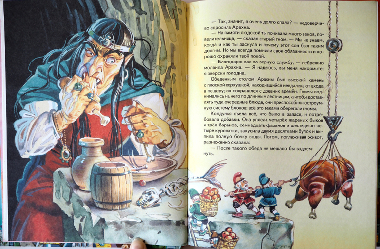 Немного напишу про наше издание - я, когда собиралась покупать всю серию, долго принимала решение об иллюстраторе. В моём детстве был Владимирский, очень люблю его иллюстрации. Но дочка к ним относительно равнодушна. Была у нас и Власова - не то. И сейчас, просмотрев её иллюстрации вижу, что не зря мы не стали дальше покупать книги с её оформлением. Джюс какой-то нелепый, Арахна добрая тётушка, да и вообще не стыкуются многие образы с книгами. В итоге Кристина сама выбрала именно с иллюстрациями Канивца, которые, конечно, на любителя. Я быстро привыкла, не так уж они и плохи. Огромный плюс в том, что их много и они достаточно подробные. Не как у Владимирского - в основном только герои, без окружения. А много иллюстраций природы, домов, внутренние помещения довольно подробно изображены. Сравнивая 3,4,5 части я вижу, что Владимирский уже не особенно старался что ли. Лично для меня они очень проигрывают первым двум книгам. А у Канивца этого нет. Иллюстраций много, уровень примерно один во всех историях. Ну и размер, конечно, играет роль - большой формат интересней листать и рассматривать. Подводя итог - я не жалею, что мы выбрали именно эту серию. Но прикупить с иллюстрациями Владимирского руки всё же чешутся))) Хотя бы первую книгу для себя.