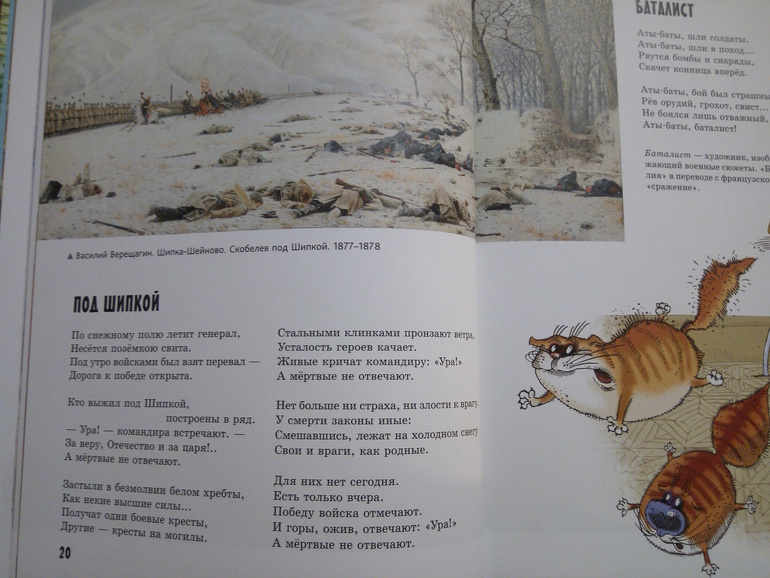 "Скобелев под Шипкой" неожиданно заворожила. Дочка ее рассматривала дольше других и постоянно возвращалась к этой картине, перечитывала стих. Может, дело в том, что на первом плане убитые солдаты. Она долго в них всматривалась и спросила: почему на них форма разного цвета? Была поражена, когда узнала, что погибшие были с обеих сторон. Оказывается, до этого она была почему-то уверена, что погибают только солдаты проигравшей стороны. Спрашивала: "Так вот они, получается, победили?", показывая на погибших. Трудно сказать. Я ответила, что победили, наверное, те, кто выжил, а мертвым уже все равно. Собственно, об этом и стих был.