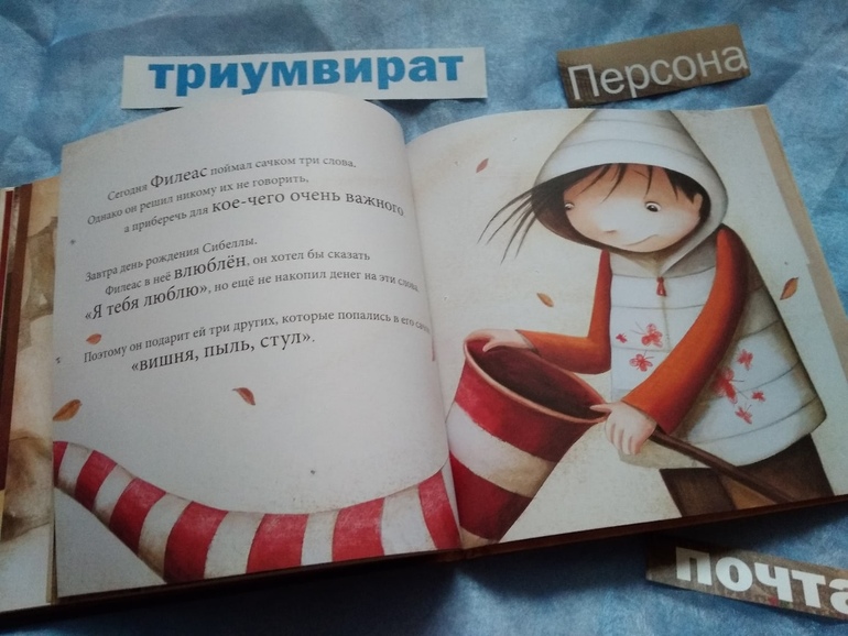 Очень похожая тема, и мальчик с сачком на обложке. Но в отличие от Роберто сачок у Филеаса не в горошек, а в полосочку. И ловит он им вовсе не бабочек, а... слова. Да, слова. Филеас живет в удивительной странной стране. Люди там почти не разговаривают. Потому что для того, чтобы что-то сказать, слова сначала нужно купить и проглотить как пилюлю. Днем и ночью работает в этой стране фабрика, с конвейеров которой потоком льются слова - все слова разговорного языка. Страна эта так и называется - Фабрика Слов. Как и у любого товара, стоимость у выпускаемых слов очень разная. Самые важные. нужные и красивые стоят очень дорого и далеко не каждый может ими пользоваться в своей речи. На распродажах задешево можно купить никому не нужные устаревшие и редкие слова. А бывает, что ветер уносит слова с фабрики и поэтому детей можно часто увидеть с сачками. И перед нем рождения Сибеллы, девочки, которая очень нравится Филеасу, ему удается поймать для подарка три слова. Но совсем не тех, о которых он мечтал. Три случайных разрозненных слова. Как с их помощью выразить все, что хочется сказать?