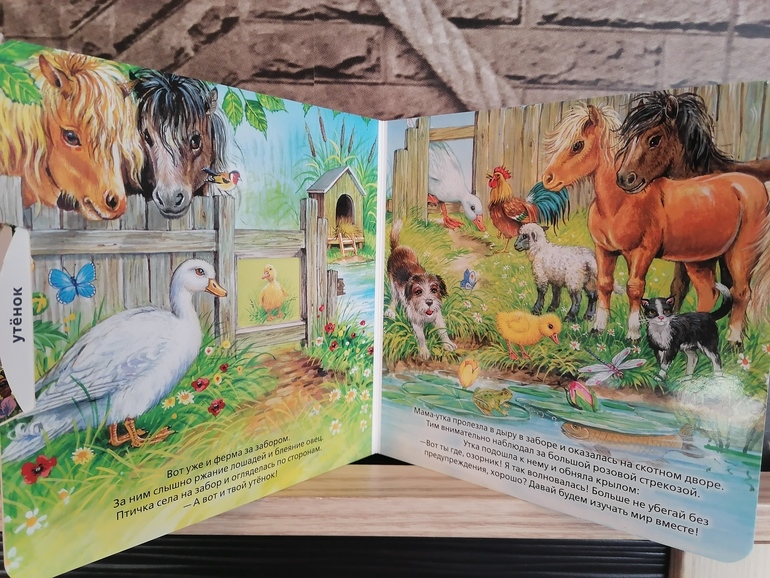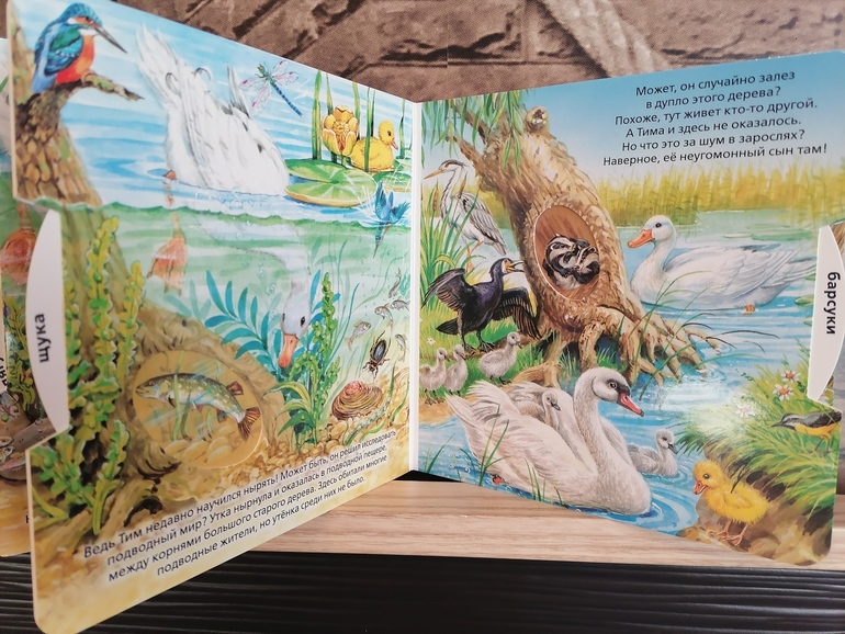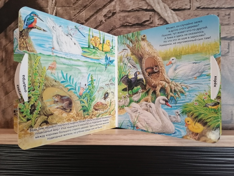 В этой книге рассказывается о том, как мама-утка ищет своего утенка у пруда, каких животных она встречает во время поисков. Мои дети уже легко запомнили, кто живёт в норе, в дупле и тп. Очень нравится крутить колесо и изучать в игровой форме обитателей пруда и его окрестностей, вот плывёт выдра, а на дне в водорослях мы видим сома... Конечно же, заканчивается все хорошо и мама находит своего утенка-озорника:)
